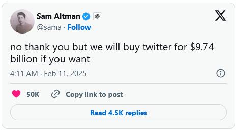 Ngay sau khi tin tức được công bố, ông Altman đã đăng trên X (trước đây là Twitter): "không cảm ơn, nhưng chúng tôi sẽ mua Twitter với giá 9,74 tỷ USD nếu bạn muốn." Ông Musk sau đó đã trả lời dòng tweet này bằng một từ ngắn gọn: "Lừa đảo".