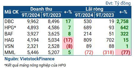 Với kết quả quý 3, bức tranh luỹ kế của nhóm chăn nuôi heo không có nhiều khác biệt. Sau 9 tháng, Dabaco lãi 530 tỷ đồng, gấp 28 lần cùng kỳ; BAF lãi 214 tỷ đồng, gấp 4 lần cùng kỳ; mảng nông nghiệp HPG lãi gấp hơn 7 lần, đạt 689 tỷ đồng. Riêng MML tuy vẫn lỗ 72 tỷ đồng, nhưng là sự phục hồi mạnh so với cùng kỳ lỗ 318 tỷ đồng. Hơn nữa, Doanh nghiệp đặt mục tiêu lỗ sau thuế 400 tỷ đồng trong năm 2024, nên kết quả này có thể xem là thành công.