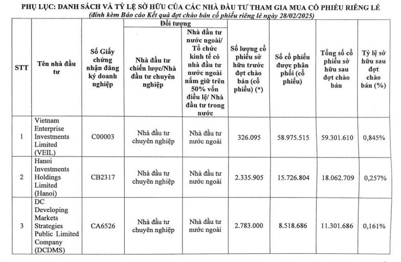 Trong số các nhà đầu tư tham gia mua cổ phiếu riêng lẻ đợt này của BIDV, 4 quỹ thành viên thuộc Dragon Capital mua vào tổng cộng 85 triệu cổ phiếu, qua đó nâng tỷ lệ sở hữu lên 1,29% vốn tại BID. Ngoài ra, cơ cấu nhà đầu tư còn có sự góp mặt của Tổng công ty Đầu tư và kinh doanh vốn Nhà nước (SCIC) mua 38,6 triệu cổ phiếu, nâng sở hữu từ 0% lên 0,551% vốn.