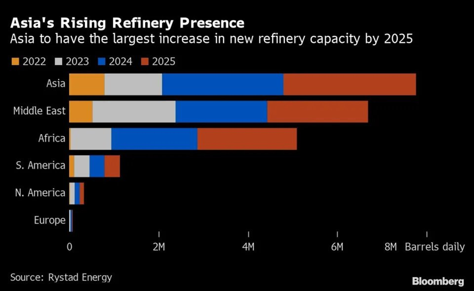 Khoảng cách đó dự báo sẽ mở rộng. Theo ước tính của Rystad Energy, khoảng 8 triệu thùng mỗi ngày trong công suất lọc dầu mới sẽ được đưa vào hoạt động trong ba năm tới, với sự bổ sung nhiều nhất từ châu Á và ít nhất từ châu Âu.