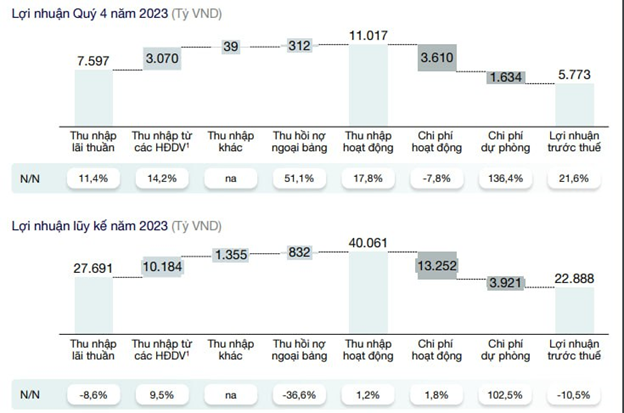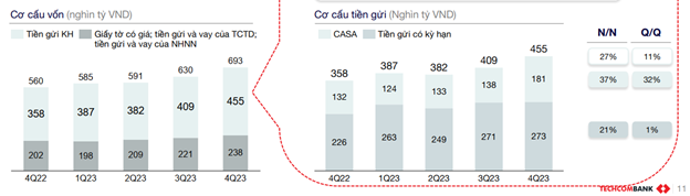 Trong đó, nguồn thu chính của Techcombank là thu nhập lãi thuần đã tăng trưởng trở lại trong quý 4 (tăng 11,4% so với cùng kỳ năm 2022) sau 3 quý ghi nhận giảm. Thanh khoản hệ thống dồi dào và lãi suất huy động giảm giúp chi phí vốn cải thiện còn 4,2% trong quý 4, so với 4,7% tại quý 3 và 5,4% tại quý 2 năm 2023. Đây là nhân tố quan trọng giúp Techcombank tăng trưởng thu nhập lãi thuần dù đã đẩy mạnh giảm lãi suất cho vay để hỗ trợ khách hàng trong giai đoạn khó khăn.