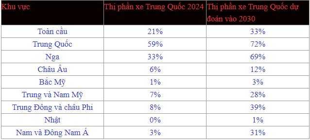 Các thị trường có khả năng ngăn cản xe Trung Quốc là Bắc Mỹ (nhờ thuế nhập khẩu 100%) và Nhật Bản (vì người dùng nước này không mặn mà với xe điện - điểm mạnh nhất của xe Trung Quốc). Tuy nhiên, châu Âu (thị phần xe Trung Quốc dự đoán tăng từ 6 lên 12%) và Nga (33 lên 69% thị phần) sẽ là các nguồn tăng trưởng lớn cho xe Trung Quốc.