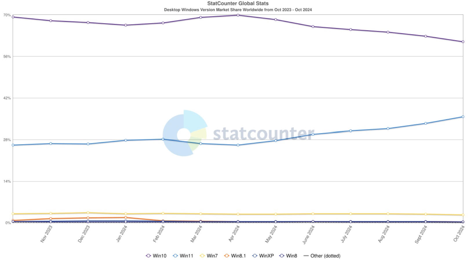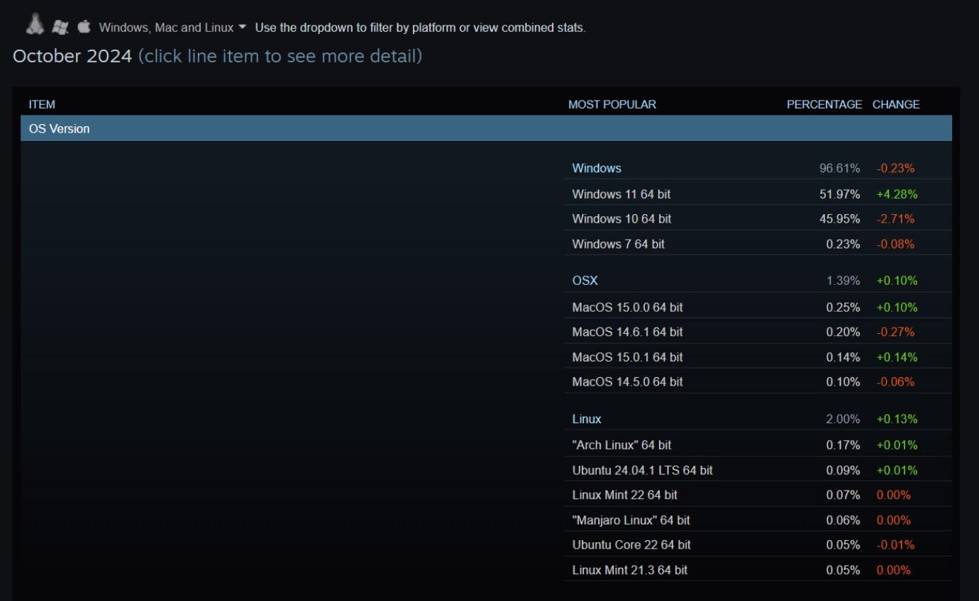 Về thị phần, trong khi Windows 11 lại là lựa chọn hàng đầu của game thủ với khảo sát phần cứng và phần mềm của Steam vào tháng 10 năm 2024 cho thấy mức tăng trưởng mạnh 4,28% ở người dùng Windows 11 64-bit, đang chiếm 51,97%, lượng người dùng Windows 10 64-bit giảm 2,71% và hiện ở mức 45,95%, thì số liệu thống kê toàn thị trường gần đây từ StatCounter vẫn đáng lo ngại.