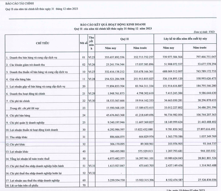 Tại thị trường nội địa, do ảnh hưởng khó khăn chung từ nền kinh tế thế giới và nền kinh tế trong nước dẫn đến chi phí giá vốn và các chi phí bán hàng khác tăng hơn cùng kỳ, đây cũng là yếu tố làm ảnh hưởng không tốt đến kết quả kinh doanh quý II/2023.