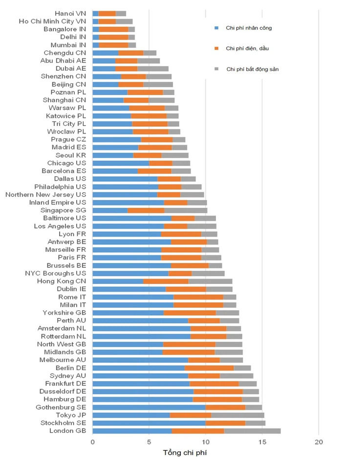 Tại nhiều quốc gia, xu hướng chung là chi phí nhân công chiếm cao nhất trong tổng chi phí thuê kho bãi nhưng Việt Nam, Ấn Độ thì ngược lại. Cụ thể, chi phí thuê nhân công tại Hà Nội và TP HCM bằng với Delhi, Mumbai, Bangalore (Ấn Độ), chiếm thấp nhất trong tổng chi phí thuê kho bãi.
