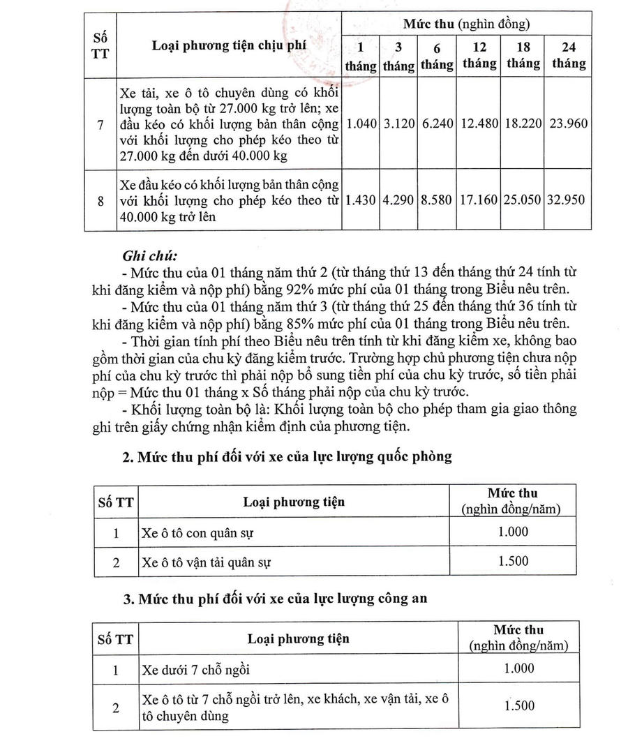 + Đối với xe ô tô có chu kỳ kiểm định trên 01 năm (18 tháng, 24 tháng và 36 tháng): Chủ phương tiện phải nộp phí sử dụng đường bộ theo năm (12 tháng) hoặc nộp cho cả chu kỳ kiểm định (18 tháng, 24 tháng và 36 tháng).