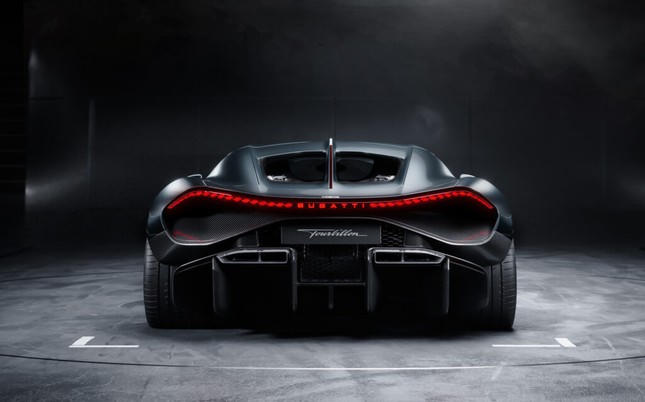 Tạo hình phần đuôi của Bugatti Tourbillon gợi liên tưởng tới một chiếc McLaren P1 khi kết hợp giữa những đường thẳng mạnh mẽ của cụm ống xả kép và đường cong của dải đèn hậu LED uốn lượn theo viền khung xe.