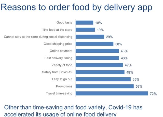 Phần lớn (72%) lý do đưa ra cho việc sử dụng dịch vụ giao đồ ăn trực tuyến là tiết kiệm thời gian. Bên cạnh đó, các khuyến mãi hay việc đảm bảo an toàn trong mùa dịch Covid-19 cũng được 49-58% người đồng tình.