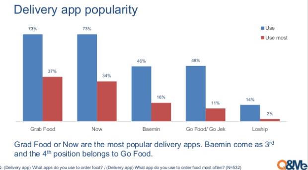 Trong số 1.046 người thực hiện khảo sát, tỷ lệ sử dụng Grab Food và Now đều lên tới 73%. Baemin và GoFood (Gojek) khiêm tốn hơn, khoảng 46%. Doanh nghiệp nội duy nhất góp mặt trong báo cáo là Loship hiện chỉ được 14% người sử dụng.