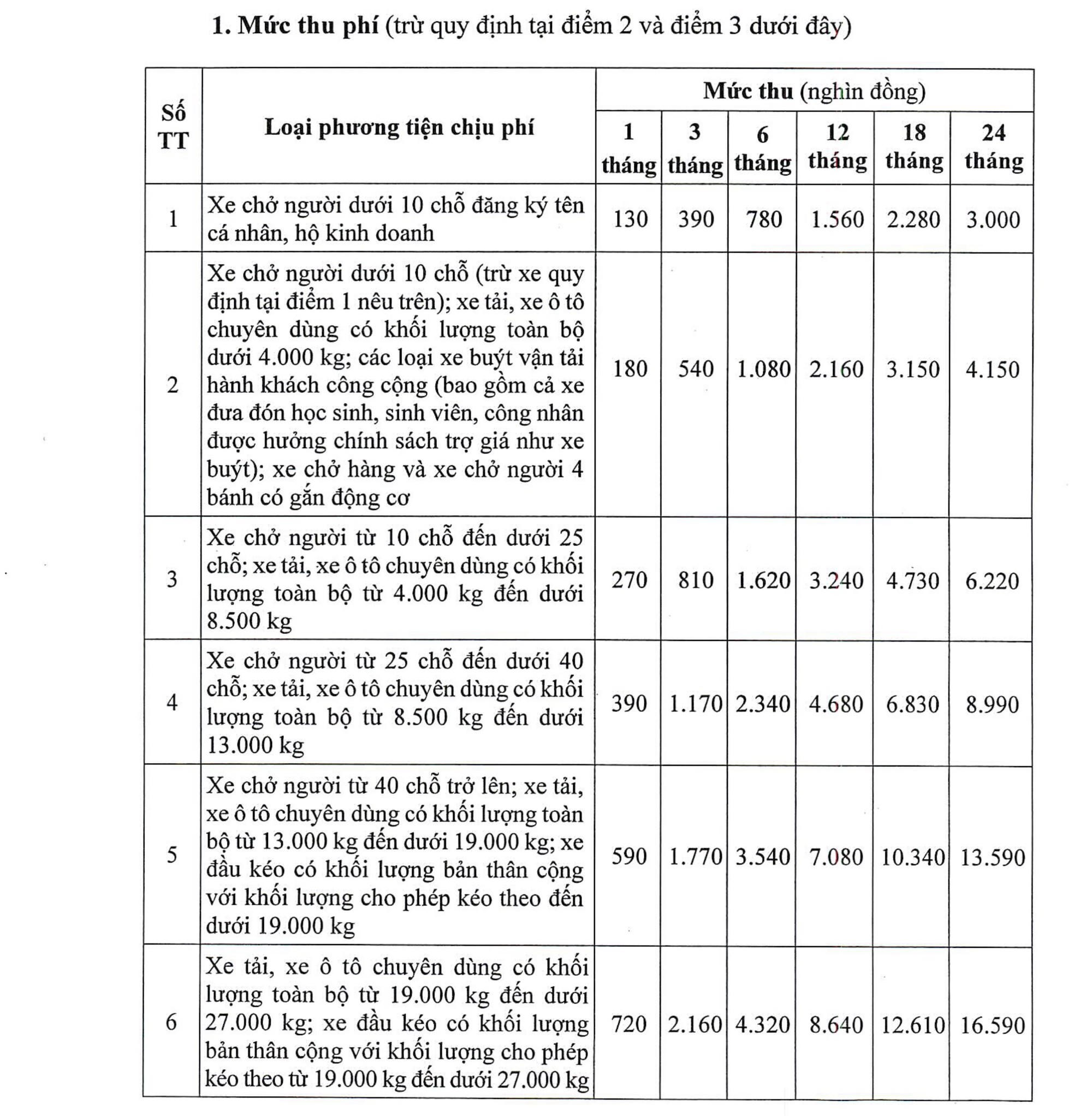 Biểu mức thu phí sử dụng đường bộ
