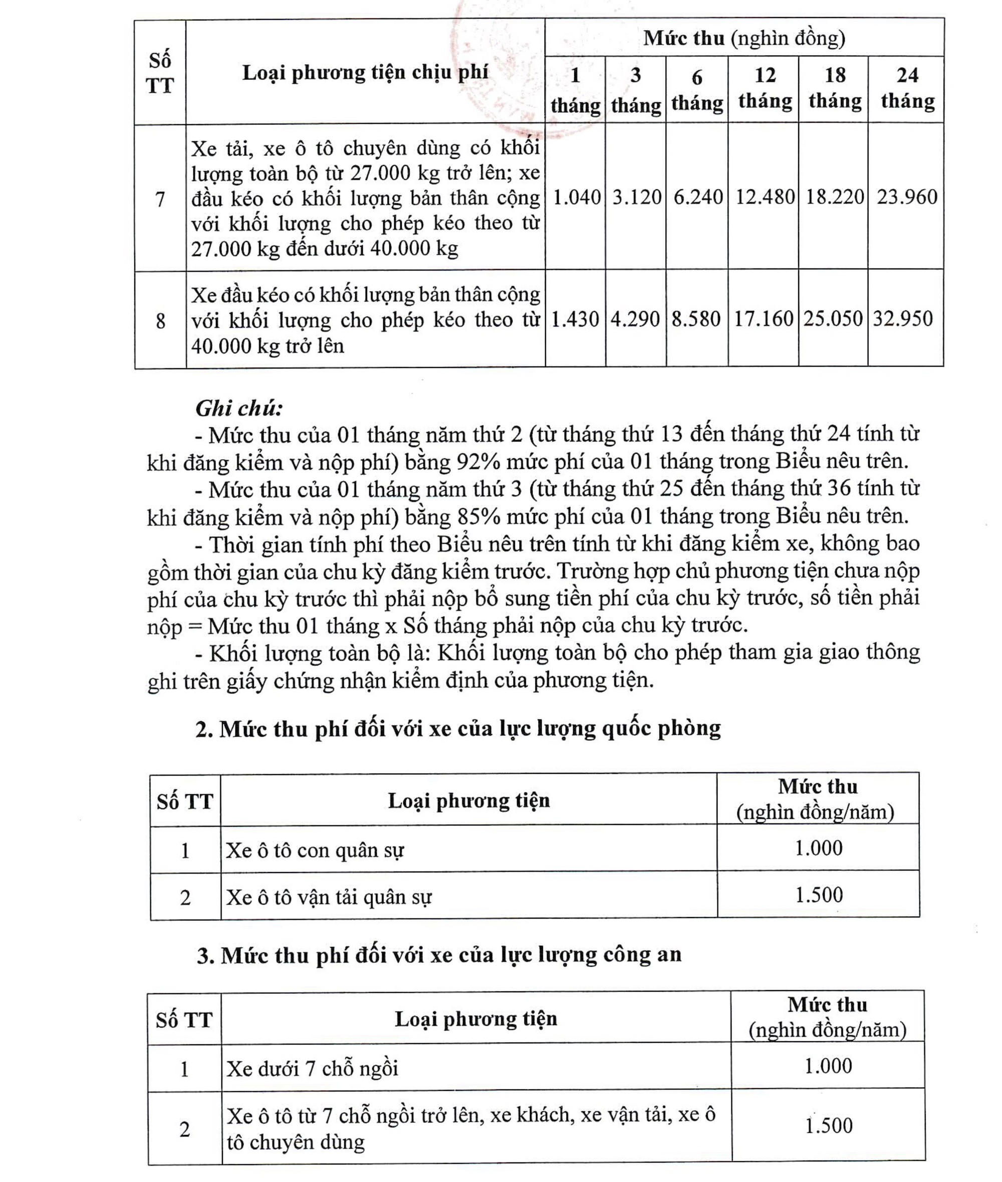 Trường hợp nộp phí theo chu kỳ kiểm định (18 tháng, 24 tháng và 36 tháng): Đơn vị đăng kiểm cấp Tem nộp phí sử dụng đường bộ tương ứng với chu kỳ kiểm định. Hết thời hạn nộp phí (chu kỳ kiểm định), chủ phương tiện phải đến đơn vị đăng kiểm để kiểm định và nộp phí cho chu kỳ kiểm định tiếp theo.