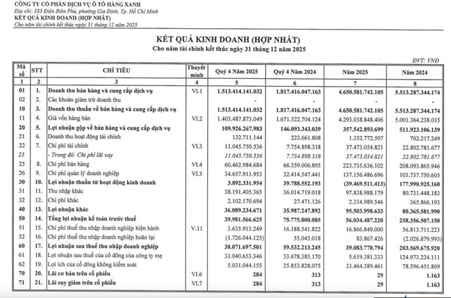 CTCP Dịch vụ Ô tô Hàng Xanh (Haxaco, mã ck: HAX) vừa công bố báo cáo kết quả kinh doanh quý IV/2025 và lũy kế năm 2025 với nhiều chỉ tiêu sụt giảm so với cùng kỳ năm trước.