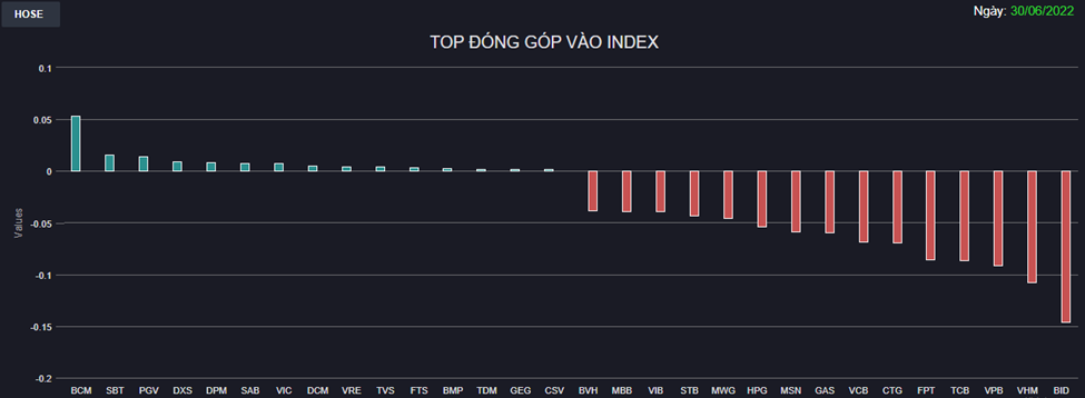 Bộ ba nhóm ngành ngân hàng, chứng khoán, thép giảm là những tác nhân chính khiến chỉ số giảm điểm sâu. Riêng trong top 15 cổ phiếu ảnh hưởng lớn nhất đến VN-Index, nhóm ngân hàng đã đóng góp tới 8 cái tên như BID, VPB, TCB, CTG, VCB,...