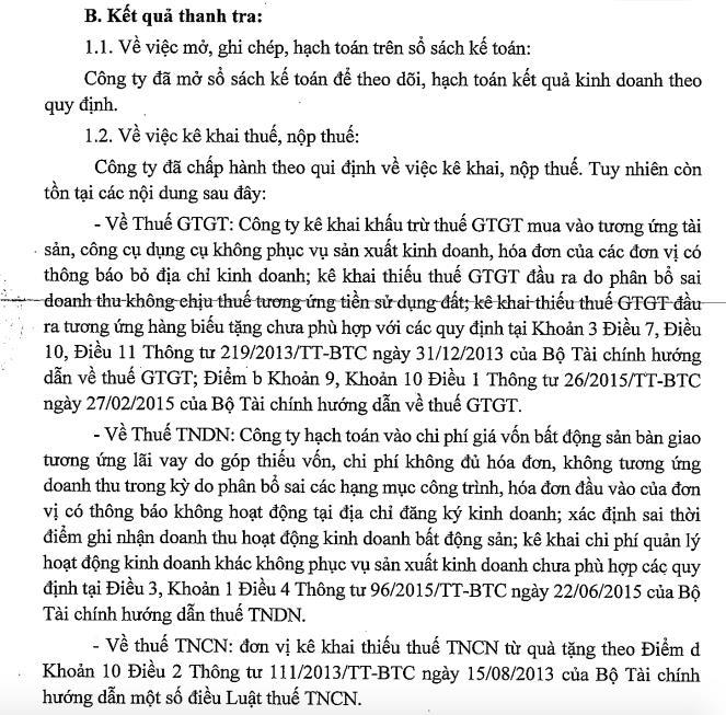 Về thuế Thu nhập doanh nghiệp, cơ quan chức năng cũng chỉ rõ, công ty hạch toán vào chi phí giá vốn bất động sản bàn giao tương ứng lãi vay do góp thiếu vốn, chi phí không đủ hóa đơn, không tương ứng doanh thu trong kỳ do phân bổ sai các hạng mục công trình, hóa đơn đầu vào của đơn vị có thông báo không hoạt động tại địa chỉ đăng ký kinh doanh; xác định sai thời điểm ghi nhận doanh thu hoạt động kinh doanh bất động sản; kê khai chi phí quản lý hoạt động kinh doanh khác không phục vụ sản xuất kinh doanh chưa phù hợp các quy định tại Điều 3, khoản 1 điều 4 Thông tư 96/2015/TT-BTC ngày 22/6/2015 của Bộ Tài chính hướng dẫn thuế thu nhập doanh nghiệp.