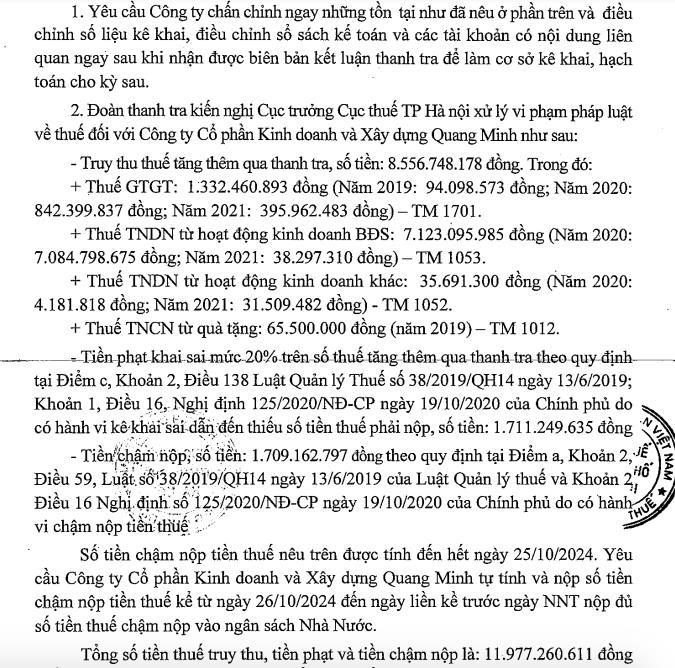 Theo kết luận thanh tra, do công ty Quang Minh đã vướng nhiều sai phạm về thuế GTGT, thuế thu nhập doanh nghiệp, thu nhập cá nhân... nên bị truy thu thuế và bị phạt, tiền chậm nộp số tiền 11,97 tỷ đồng.
