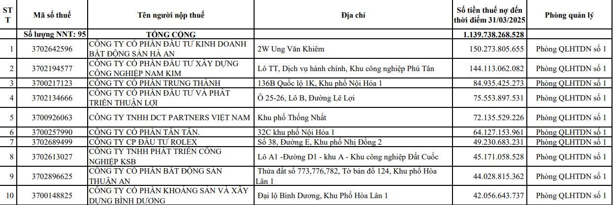 Chi cục Thuế Khu vực XVI (phụ trách quản lý thuế tại ba tỉnh Bình Dương, Bình Phước và Tây Ninh) vừa công bố danh sách 95 người nộp thuế đang nợ tiền thuế và các khoản thu khác thuộc ngân sách Nhà nước, tính đến thời điểm 31/3/2025. Tổng số tiền nợ thuế của các tổ chức, doanh nghiệp trong danh sách này lên tới gần 1.140 tỷ đồng, trong đó có nhiều trường hợp nợ từ hàng chục đến hàng trăm tỷ đồng.
