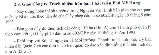 Đáng chú ý, kết luận thanh tra còn chỉ ra việc triển khai 5 cụm đô thị A, B, C, D, E của Công ty TNHH Phát triển Phú Mỹ Hưng đến thời điểm hiện nay chủ yếu tập trung tại khu chức năng số 1 (khu A), còn lại các khu B, C, D, E (khu 8, 12, 16, 18) chưa triển khai lập quy hoạch vì chưa được bàn giao đất; chưa xây dựng hoàn chỉnh tuyến đường Nguyễn Văn Linh theo tiến độ giấy phép đầu tư số 602/GP ngày 19/5/1993 vì các làn xe qua các khu B, C, D, E chưa bàn giao đất.