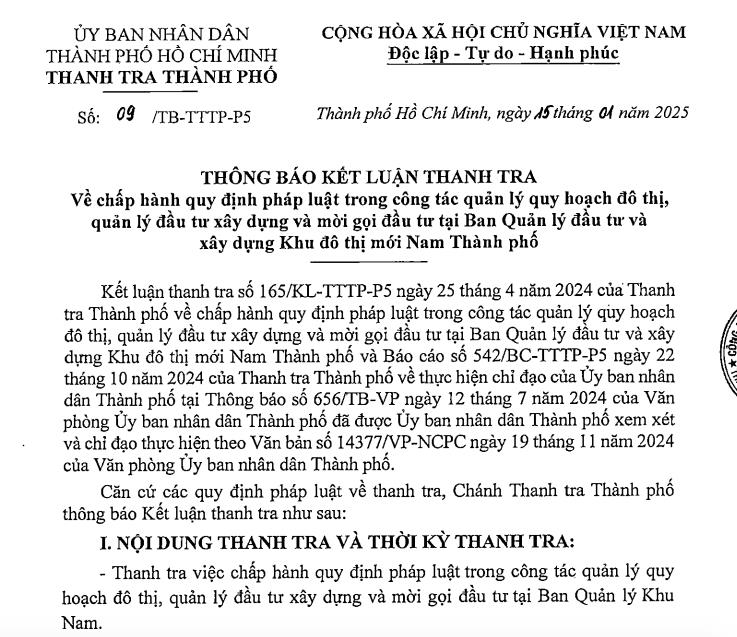 Ngày 15/1/2025, Thanh tra TP.HCM công bố kết luận thanh tra số 09/TB-TTTP-P5 về chấp hành quy định pháp luật trong công tác quản lý quy hoạch đô thị, quản lý đầu tư xây dựng và mời gọi đầu tư tại Ban Quản lý đầu tư và xây dựng Khu đô thị mới Nam Sài Gòn. Trong đó có nhiều nội dung vi phạm liên quan đến Công ty TNHH Phát triển Phú Mỹ Hưng - chủ đầu tư Khu đô thị Phú Mỹ Hưng quận 7.