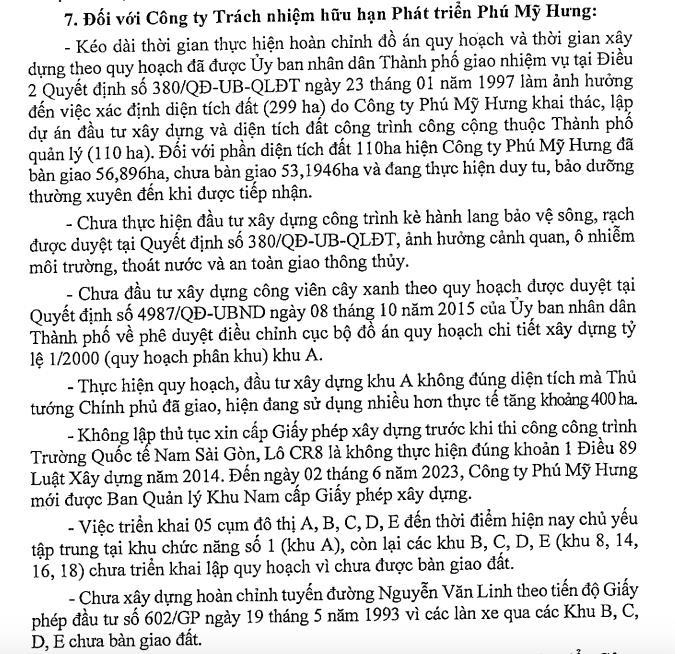 Thông báo kết luận thanh tra, Công ty TNHH Phát triển Phú Mỹ Hưng kéo dài thời gian thực hiện hoàn chỉnh đồ án quy hoạch và thời gian xây dựng theo quy hoạch đã được UBND TPHCM giao nhiệm vụ tại Điều 2 quyết định số 380/QĐ-UB-QLĐT ngày 23/1/1997, làm ảnh hưởng đến việc xác định diện tích đất (299 ha) do Công ty TNHH Phát triển Phú Mỹ Hưng khai thác, lập dự án đầu tư xây dựng và diện tích đất công trình công cộng thuộc TPHCM quản lý (110 ha).