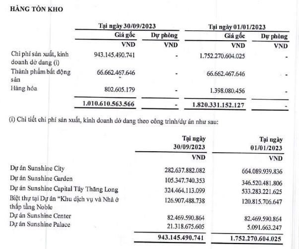 Hàng tồn kho của SSH giảm mạnh về 943 tỷ đồng, trong khi cùng kỳ ghi nhận tại 1.752 tỷ đồng. Trong hàng tồn kho, phần nhiều là chi phí sản xuất kinh doanh dở dang, cụ thể ở các dự án Sunshine City, dự án Sunshine Garden, dự án Sunshine Capital Tây Thăng Long, dự án Sunshine Center, hay biệt thự tại dự án khu dịch vụ và nhà ở thấp tầng Noble...