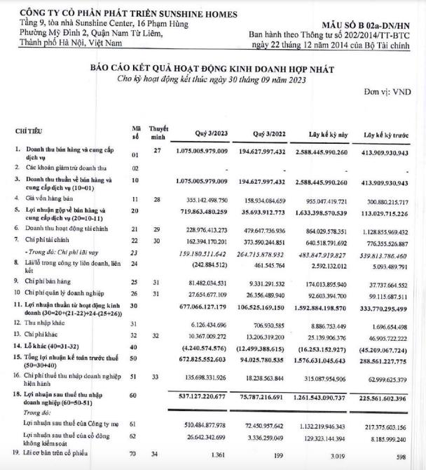 Công ty cổ phần Phát triển Sunshine Homes (mã ck: SSH) mới công bố báo cáo tài chính hợp nhất quý III/2023 với khoản ghi nhận doanh thu thuần đạt 1.075 tỷ đồng, gấp 5,52 lần so với cùng kỳ năm 2022.