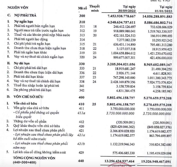 Bên cạnh việc ghi nhận lợi nhuận cao, sức khỏe tài chính Sunshine Homes cũng có sự cải thiện. Cụ thể, nợ phải trả giảm mạnh gần một nửa so với thời điểm đầu năm, giảm từ 14.056 tỷ đồng về còn 7.454 tỷ đồng.