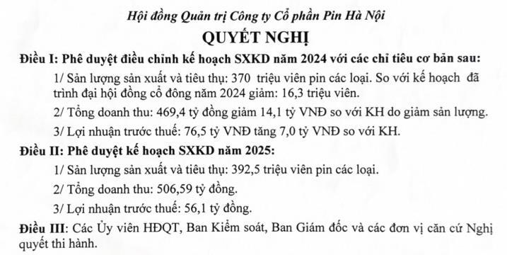 Cùng với điều chỉnh kế hoạch cho năm 2024, Hội đồng quản trị pin Hà Nội cũng phê duyệt kế hoạch kinh doanh cho năm 2025, với doanh thu và lợi nhuận dự kiến lần lượt đạt 506,59 tỷ đồng và 56,1 tỷ đồng.
