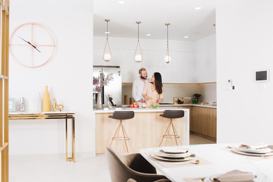 Với chủ nhân có gout, thì phòng bếp đơn điệu là không gian đầu tiên cần được thay đổi. Một quầy bar được đặt cạnh bếp tạo điểm nhấn cho không gian căn hộ thêm phần sang trọng, tiện nghi. Tại đây, các thành viên trong gia đình sẽ trải qua những phút giây thoải mái, vui vẻ và ấm cúng bên nhau.