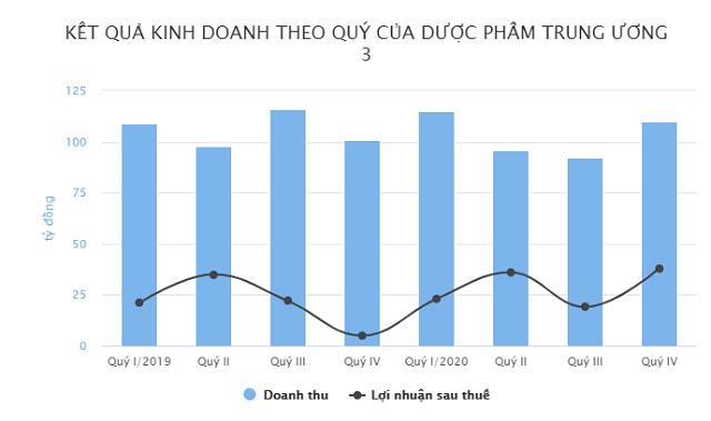 Năm 2020, lợi nhuận sau thuế của Dược phẩm Trung ương 3 tăng từ 83 tỷ đồng lên 114 tỷ. Trung bình mỗi ngày doanh nghiệp này thu về khoảng 312 triệu đồng tiền lãi.