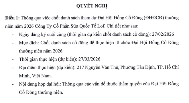 Theo đó, ngày 27/2/2026 tới, Công ty Sữa Quốc tế Lof sẽ chốt danh sách cổ đông để tham dự ĐHĐCĐ thường niên năm 2026. Đại hội dự kiến được tổ chức vào ngày 27/3/2026 tại TP.HCM.