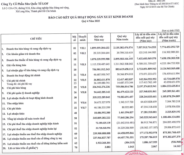 Lũy kế cả năm 2025, Sữa Quốc tế Lof mang về doanh thu thuần hơn 7.432 tỷ đồng, giảm gần 3% so với năm 2024; lợi nhuận sau thuế thu nhập doanh nghiệp đạt 177,1 tỷ đồng, giảm 79,8%.