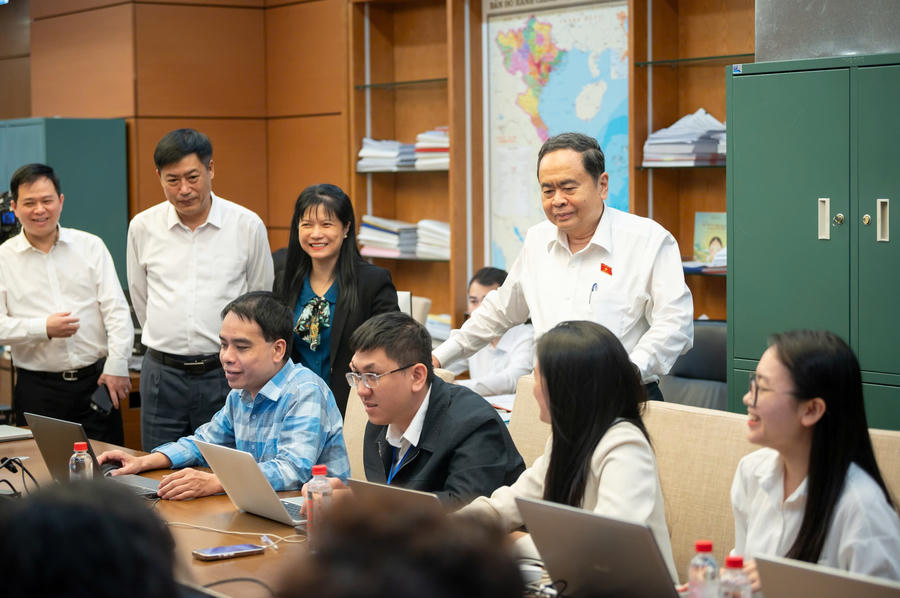 Chủ tịch Quốc hội Trần Thanh Mẫn thăm, động viên các phóng viên tại Trung tâm Báo chí bầu cử