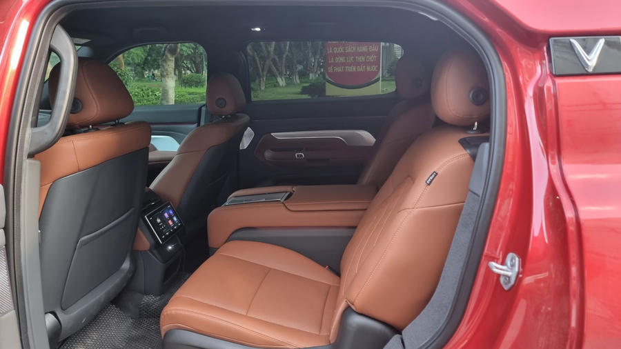 Khi đặt VF 9 lên bàn cân với các mẫu xe xăng cùng tầm tiền, anh nhận thấy khoang nội thất của VinFast VF 9 cao cấp hơn hẳn. Toàn bộ ghế ngồi bọc da, được trang trí bằng họa tiết thêu hình thoi cùng tựa đầu dập nổi logo chữ V bắt mắt. Hai hàng ghế trước đều chỉnh điện, tích hợp sưởi, làm mát, massage.