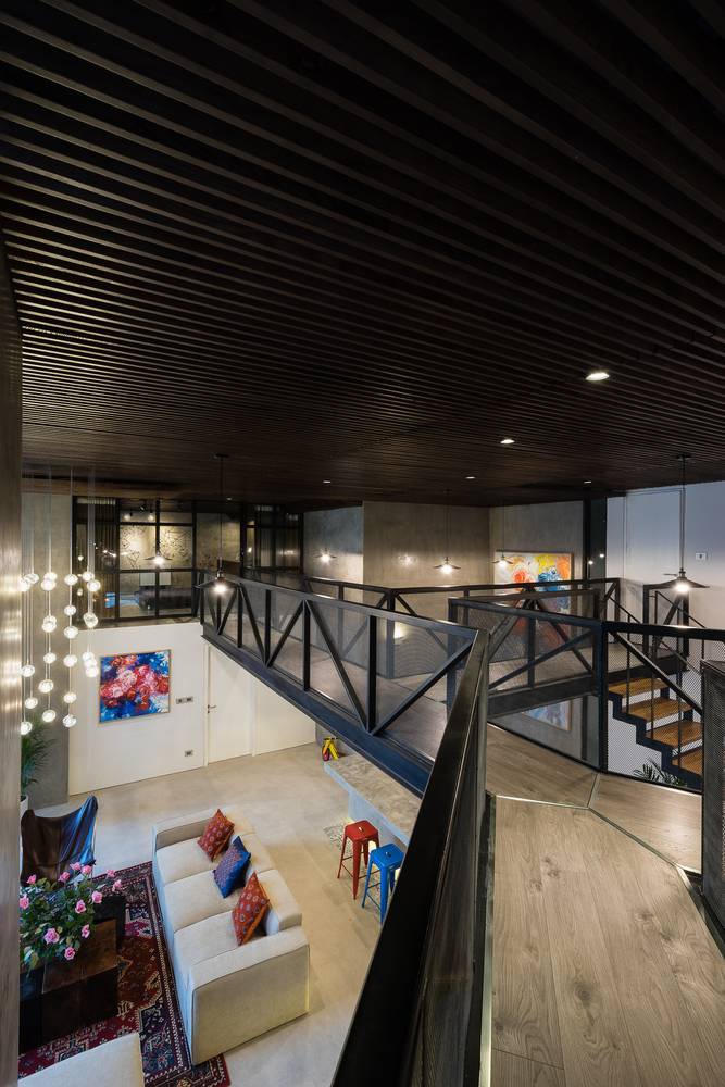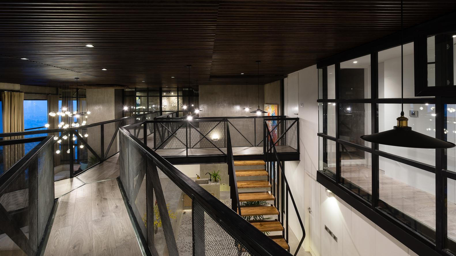 Căn hộ được thiết kế thành 2 tầng, kết nối với nhau bằng “hành lang bay”, tạo nên không gian sống độc đáo “có 1-0-2”.