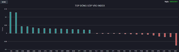 Sắc xanh chiếm ưu thế rõ rệt trên nhóm VN30 với 25 mã tăng so với 4 mã giảm và 1 mã đứng giá tham chiếu. Bộ đôi VHM và VIC tăng tích cực đóng vai trò đầu tàu kéo chỉ số tăng điểm. Nhóm ngân hàng cũng trợ lực với VCB, CTG, ACB, MBB, TCB,... đồng loạt khởi sắc. Đà tăng cũng được lan tỏa trên nhiều Bluechips như VNM, MWG, TCH, BVH....