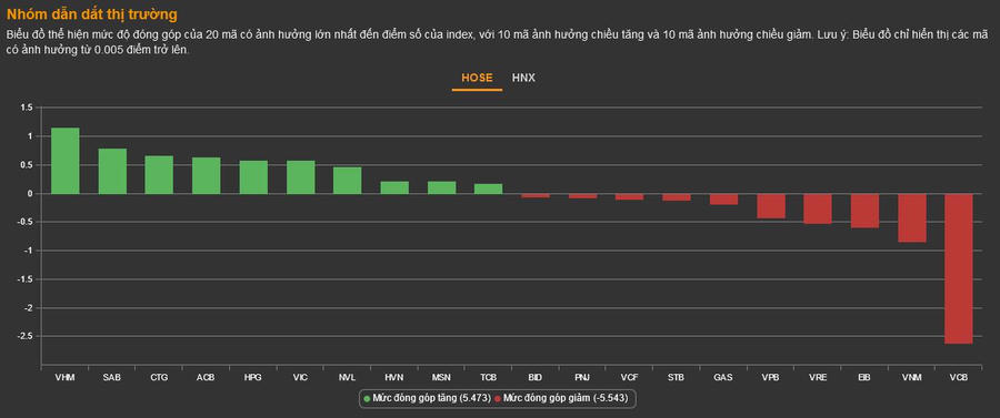 Nhóm ngân hàng hôm nay giảm trung bình 0,55%. Đặc biệt VCB sau hai phiên liên tiếp "gánh" chỉ số thì hôm nay giảm 2,52%, làm cho VN-Index rơi 2,52 điểm. BID (-0,12%), VPB (-1,34%), HDB (-0,39%), STB (-1%), TPB (-0,22%), EIB (-6,76%),... cũng là tác nhân khiến chỉ số trung bình đi xuống.
