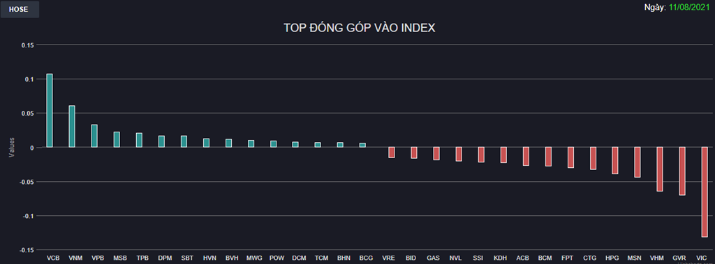 Nhờ điểm tựa từ nhóm ngân hàng đặc biệt là đầu tàu VCB, sắc xanh tiếp tục chiếm ưu thế trên thị trường và được duy trì trong phần lớn thời gian giao dịch. Tuy nhiên, áp lực chốt lời bất ngờ tăng mạnh về cuối phiên khiến chỉ số VN-Index nhanh chóng đảo chiều.