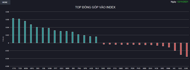 Một loạt cổ phiếu Ngân hàng như CTG, TCB, EIB, MBB, BID, VPB, ACB, MSB... đột ngột quay đầu bứt phá và hút tiền mạnh giúp thị trường nhanh chóng phục hồi và đảo chiều tăng điểm. Các Bluechips như HPG, MSN, VHM, FPT,... cũng trợ lực kéo trong khi GAS, GVR là những gánh nặng kìm chân chỉ số.
