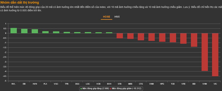 VN30 rơi 27,66 điểm, trong đó có đến 8,92 điểm là do VIC, VHM và VRE. Ngoài VIC xuất hiện thêm KDH giảm sàn và "trắng bên mua". Nhóm này chỉ còn 6 mã tăng: BVH, PLX, POW, SAB, TPB, VCB và NVL (tăng trần).