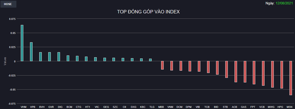 Áp lực chốt lời gia tăng thậm chí còn kéo VN-Index một lần nữa quay đầu giảm điểm về cuối phiên. Các Bluechips như MSN, HPG, MWG, VCB, FPT, GAS, ACB,... đều chìm trong sắc đỏ tạo ra áp lực lớn đè lên chỉ số.