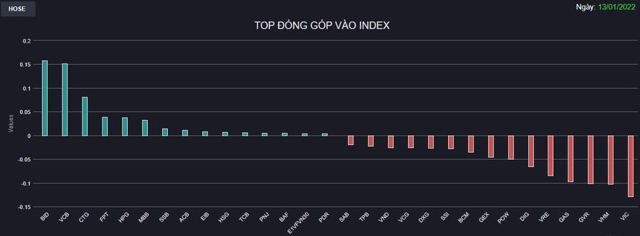 Chứng khoán 13/1: Ngân hàng kéo nửa vời, áp lực “xả” lan rộng trên các nhóm cổ phiếu nóng