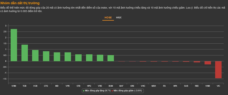 Nhóm VN30 làm tốt vai trò dẫn dắt thị trường khi có 24 mã tăng, chỉ 4 mã giảm (KDH, SAB, VIC, VNM). VHM dẫn đầu top đóng góp điểm cho VN-Index (+2,80 điểm) trong khi người anh cùng nhà VIC trái ngược hoàn toàn (-1,37 điểm).
