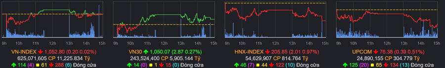 Kết thúc phiên giao dịch, chỉ số VN-Index giảm 0,2 điểm (-0,02%) về 1.052,80 điểm; HNX-Index và UPCOM-Index giảm lần lượt 0,97% và 0,52% xuống 205,85 và 76,38 điểm. Tổng giá trị giao dịch trên 3 sàn đạt 12.258 tỷ đồng - tăng hơn 2.200 tỷ so với phiên gần nhất.