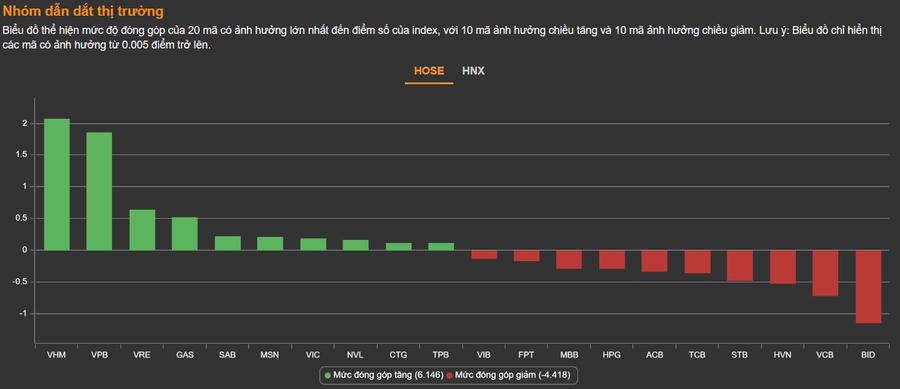 Ở rổ VN30, VPB (+6%) là tâm điểm sau khi có tin VPBank bán 15% vốn trị giá 1,4 tỷ USD cho tập đoàn tài chính Nhật Bản Sumitomo Mitsui. Ông lớn VHM cũng là điểm sáng khi tăng 4,4%, đem về cho VN-Index 2,14 điểm. Mặc dù vậy, nhiều bluechip ngân hàng giảm điểm khiến VN-Index không thể bứt phá lên trên mốc tham chiếu, trong đó BID (-1,9%), VCB (-0,7%), STB (-3,8%), ACB (-1,6%), VIB (-1,2%), MBB (-1,4%)...