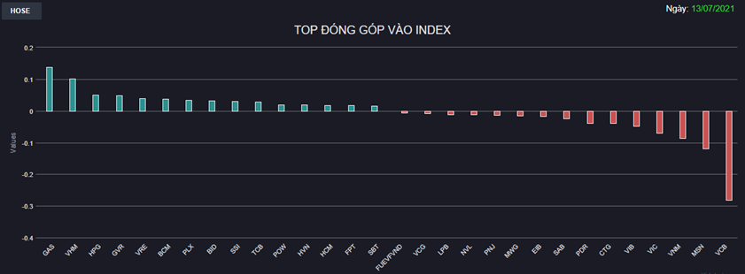 Sự vùng lên trong phiên ATC của GAS, VHM là động lực chính giúp thị trường đảo chiều tăng trở lại. Thêm nữa, diễn biến khởi sắc trên HPG, GVR, VRE, BCM, PLX,... cũng phần nào hỗ trợ chỉ số trước áp lực giảm trên MSN, VNM, VIC,... Nhóm chứng khoán cũng hồi phục khá tốt trong đó 2 “ông lớn” SSI và HCM đều tăng mạnh