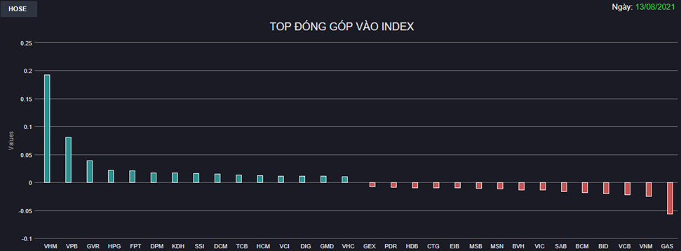Các cổ phiếu vốn hóa lớn như GAS, VNM, VCB, BID, BCM, SAB, VIC, BVH, MSN vẫn đỏ tuy nhiên mức giảm đã được thu hẹp đáng kể. Ngược lại, điểm tựa lớn nhất trong phiên hôm nay là VHM vẫn duy trì phong độ khởi sắc qua đó đưa VN-Index vượt qua giai đoạn khó khăn. VPB, GVR, HPG, FPT cũng trở lại đúng lúc hỗ trợ đà phục hồi của chỉ số.
