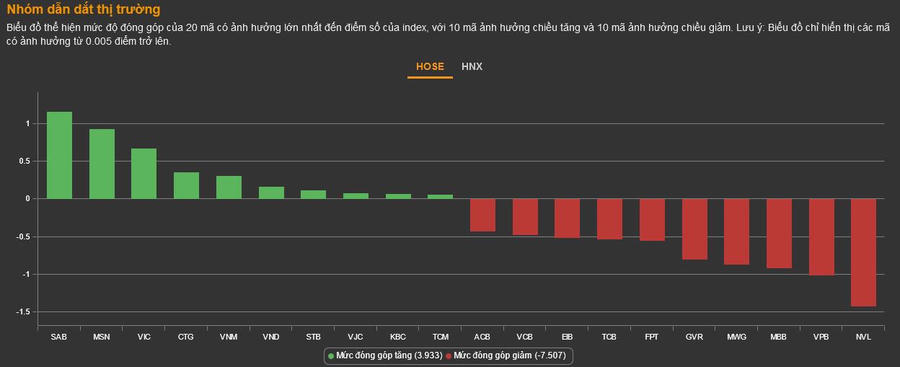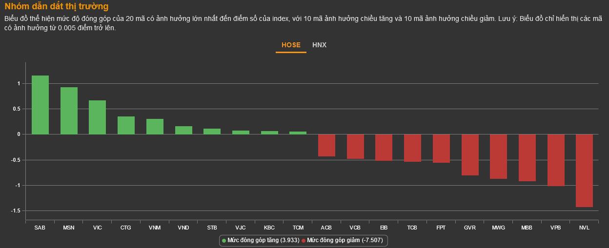 Nhóm thực phẩm - đồ uống bứt phá tăng mạnh mẽ nhờ 3 mã bluechip VNM (+0,77%), MSN (+3,01%), SAB (+3,83%) bất chấp 12 mã giảm hết biên độ như BNA, DBC, NAF, PAN, TAR, TFC,...