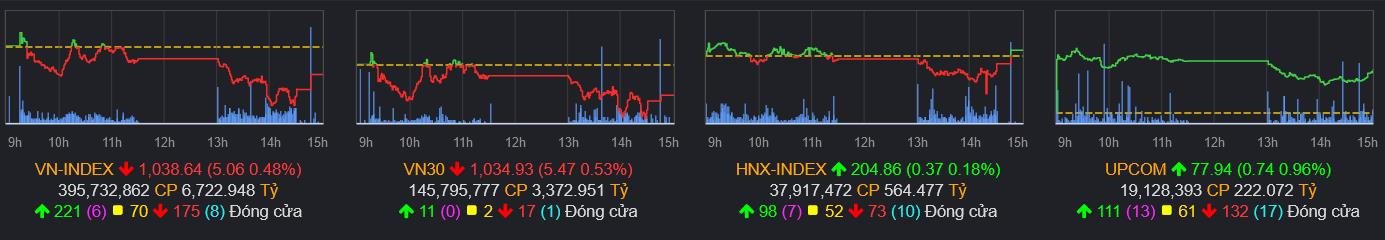 Kết thúc phiên giao dịch, chỉ số VN-Index giảm 5,06 điểm (-0,48%) về 1.038,64 điểm; HNX-Index và UPCOM-Index tăng lần lượt 0,18% và 0,96% lên 204,86 và 77,94 điểm. Tổng giá trị giao dịch trên 3 sàn đạt 7.459 tỷ đồng, giảm gần 4.500 tỷ so với phiên hôm qua.