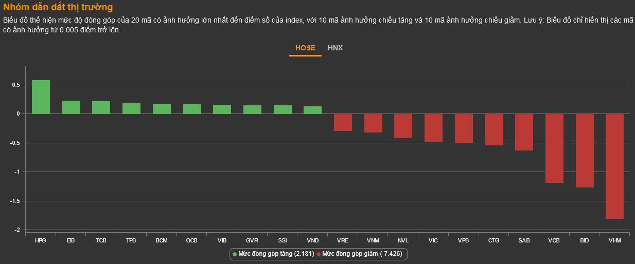 Nhiều mã ngân hàng cũng tác động tiêu cực lên chỉ số khi VCB (-1,07%), BID (-2,25%), CTG (-1,54%), VPB (-1,76%), MBB (-0,83%), ACB (-0,21%), SSB (-0,16%), STB (-0,41%)...