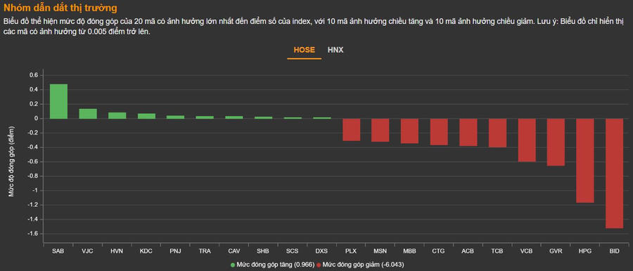 Rổ VN30 ảm đạm khi chỉ còn SAB (+1,6%) và VJC (+1%) giữ được sắc xanh cho đến khi đóng cửa. VHM và VPB - hai trụ đỡ chính của VN-Index phiên hôm qua nay cũng chỉ giữ được giá tham chiếu.